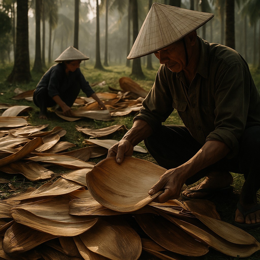 In the central coast of Vietnam, in provinces like Phú Yên where sea grape trees line the shore, artisans work with what the land offers: fallen leaves from sea grape and palm, cleaned and pressed into form. No chemicals. No harvest. Just craft passed through generations, and material that returns to the earth.